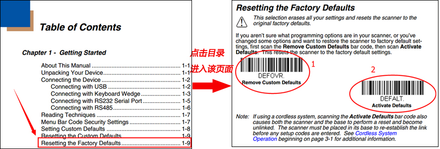 一般恢復(fù)出廠設(shè)置的介紹在第一章節(jié),如上圖,我們?cè)谀夸浿芯涂梢院苊黠@的找到【Resetting the Factory Defaults】,點(diǎn)擊進(jìn)入該頁(yè)面,依次掃描這兩個(gè)條碼即可。